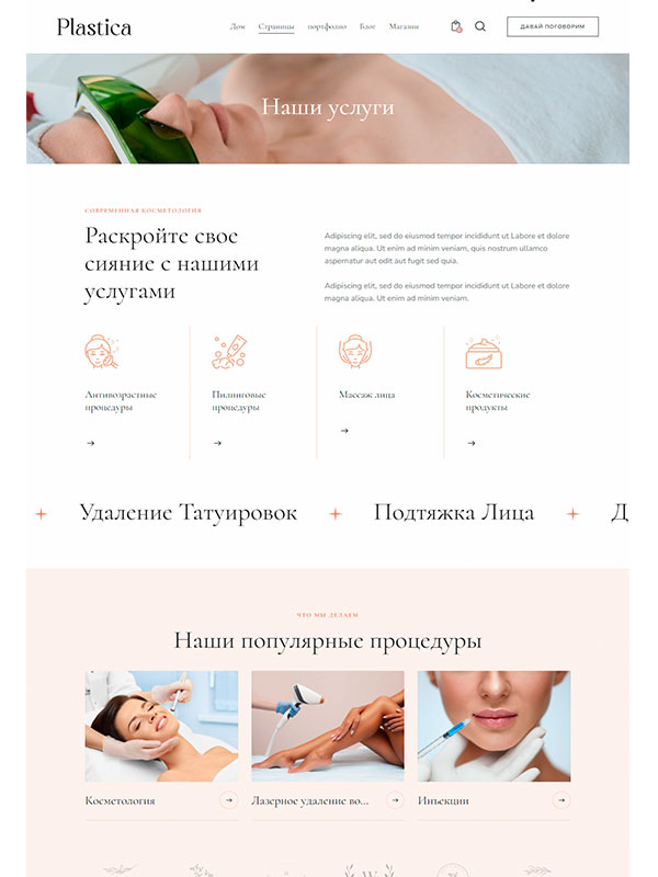 Готовые шаблоны сайтов медицинского центра косметологии и пластической хирургии- это отличный выбор для тех, кто ценит свое время и хочет получить профессиональный веб-сайт в кратчайшие сроки. Такие сайты гибко настраиваются под ваши уникальные потребности, позволяя легко изменять цвета, изображения и текстовый контент через интуитивно понятную систему управления сайтом без знания кода. Благодаря отзывчивому дизайну ваш сайт будет выглядеть превосходно на любом устройстве: смартфонах, планшетах и компьютерах.