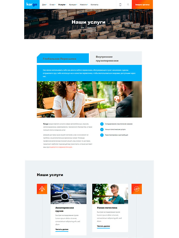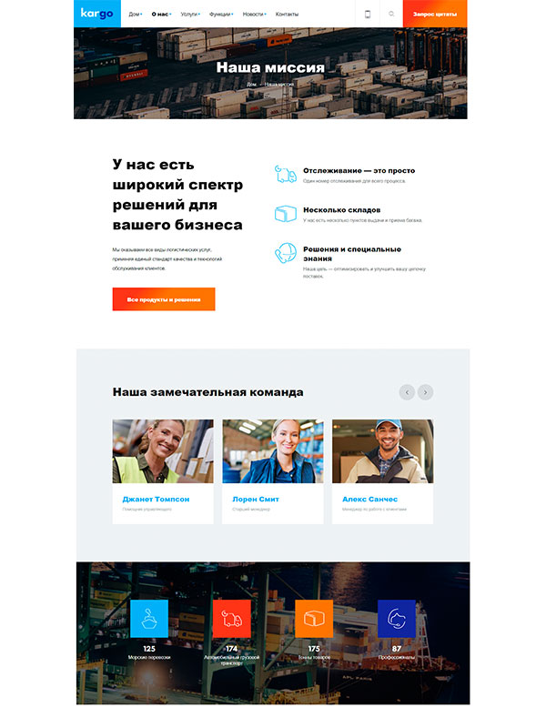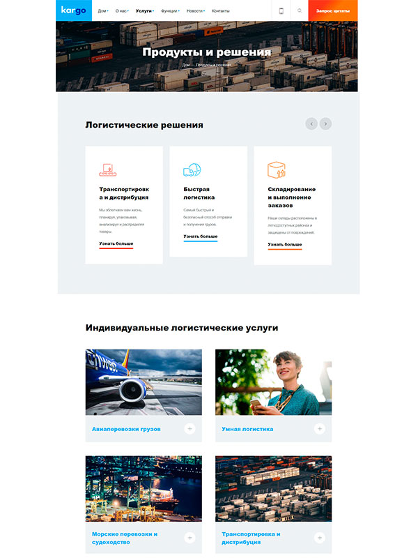 Готовые шаблоны сайтов по оказанию логистических и транспортных услуг — это отличный выбор для тех, кто ценит свое время и хочет получить профессиональный веб-сайт в кратчайшие сроки. Такие сайты гибко настраиваются под ваши уникальные потребности, позволяя легко изменять цвета, изображения и текстовый контент через интуитивно понятную систему управления сайтом без знания кода. Благодаря отзывчивому дизайну ваш сайт будет выглядеть превосходно на любом устройстве: смартфонах, планшетах и компьютерах.